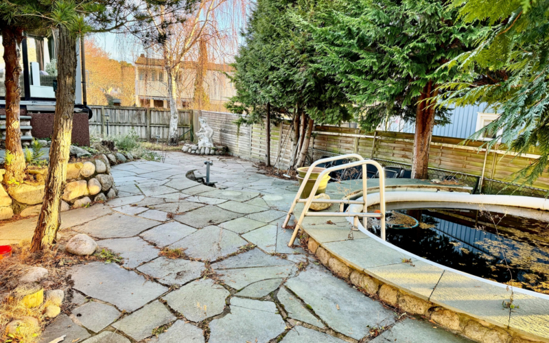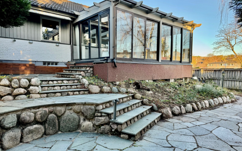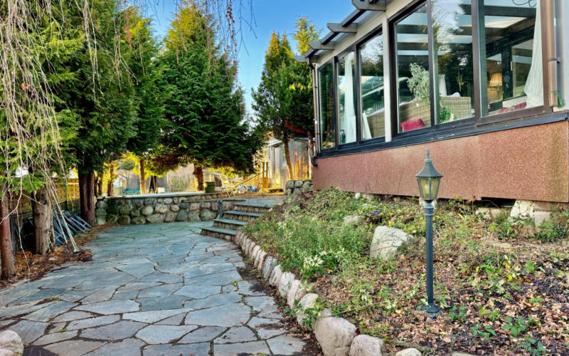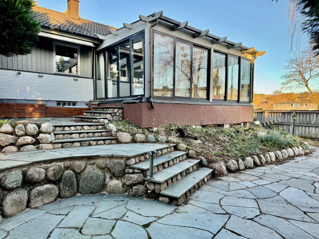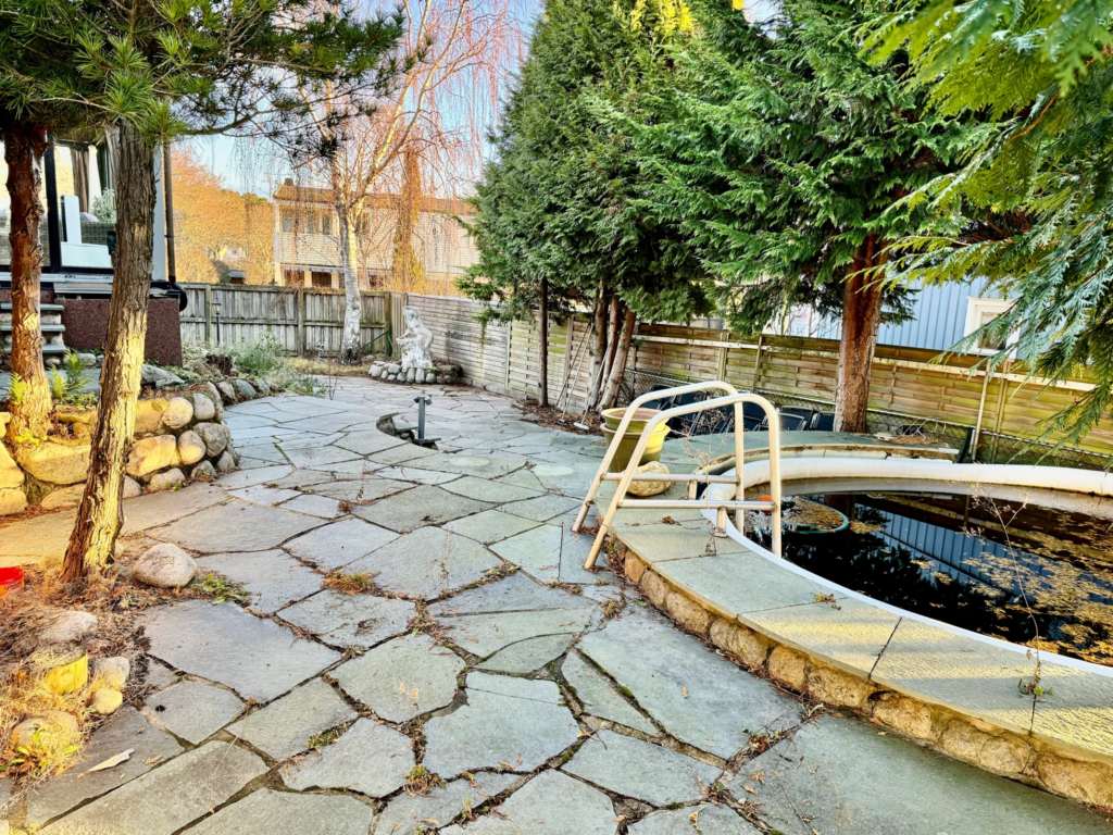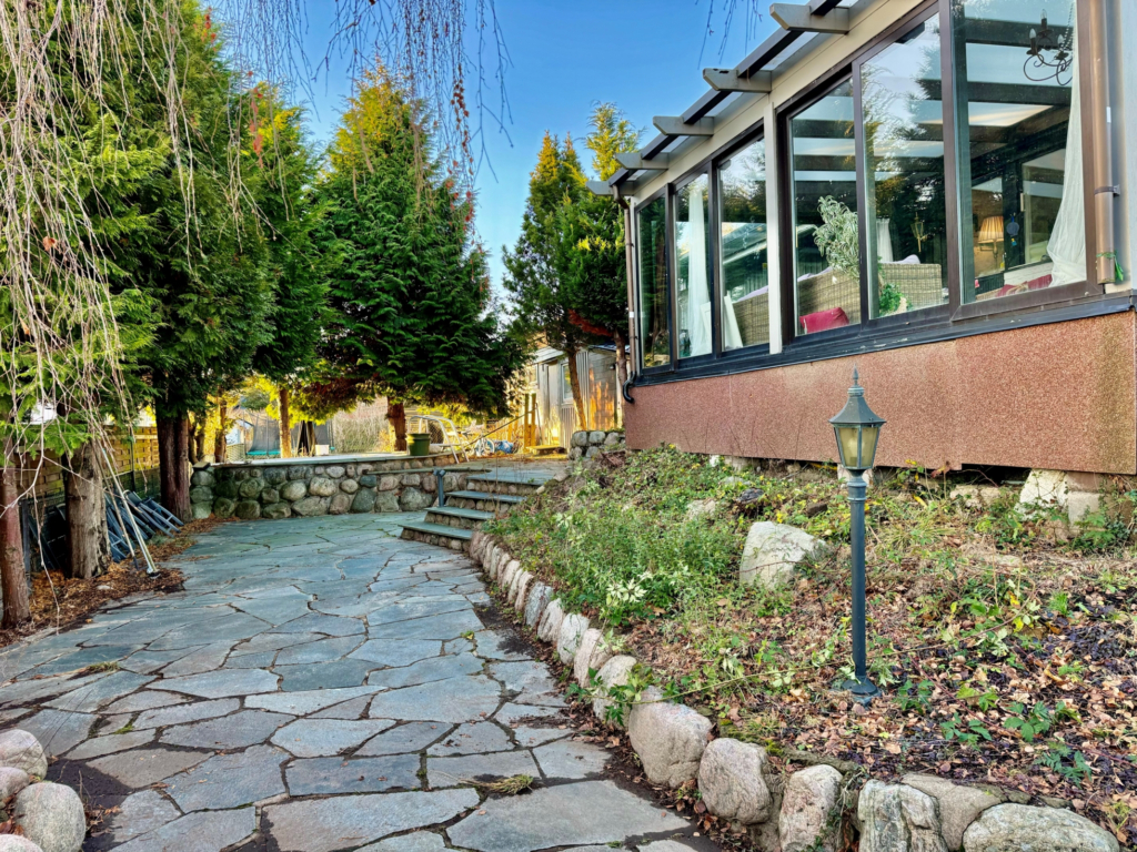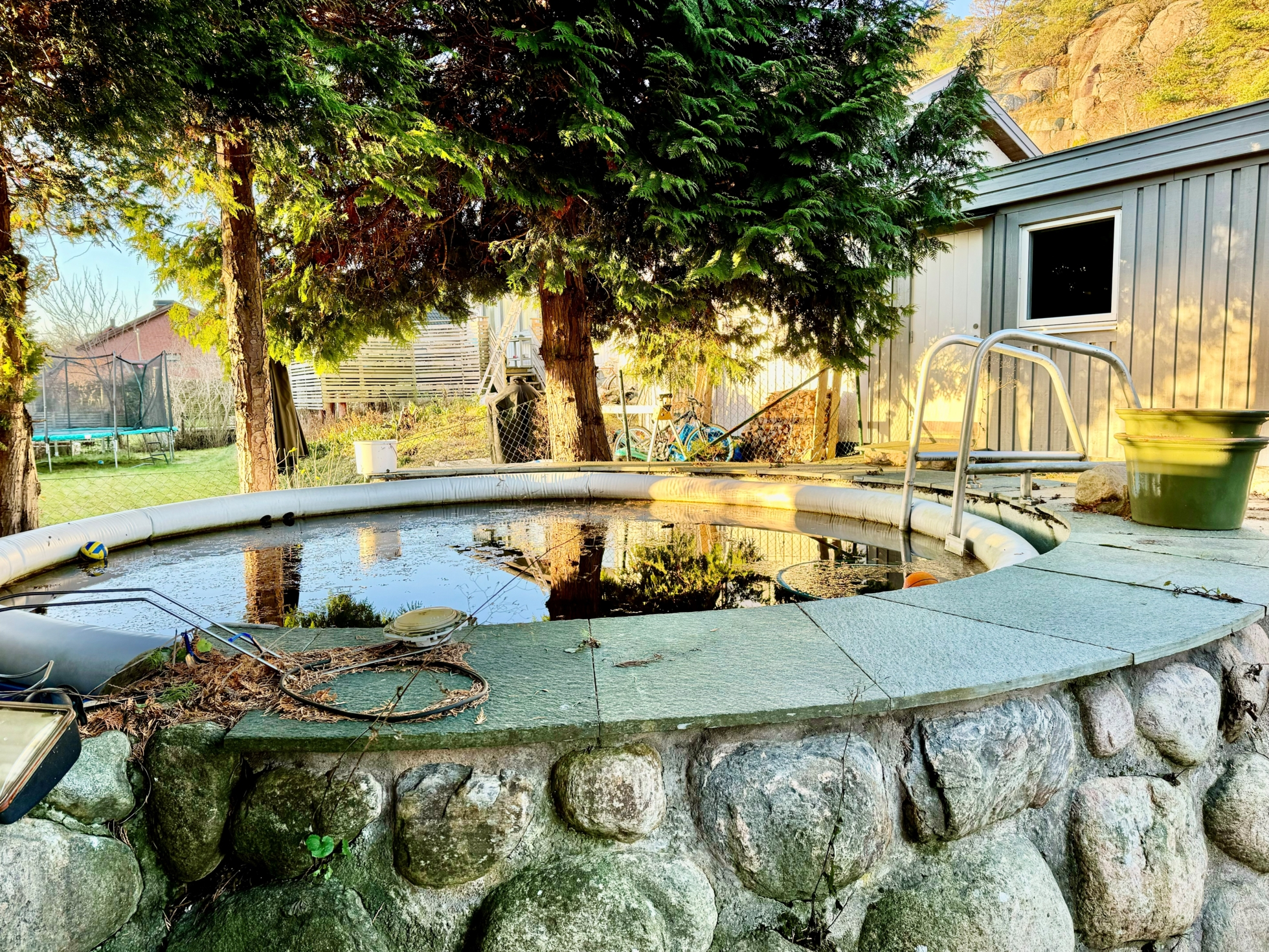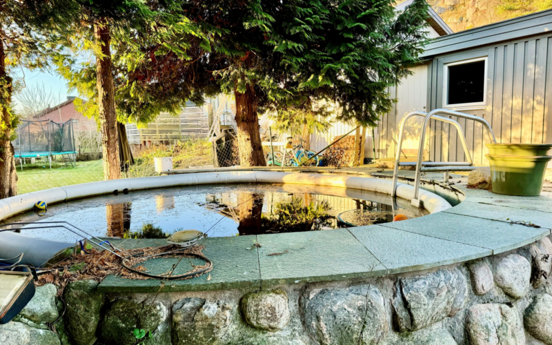 Insynsskyddad trädgård i sydväst läge, med uteplatser och poolområde. Barnvänligt läge, minimalt med trafik och sista huset på gatan.