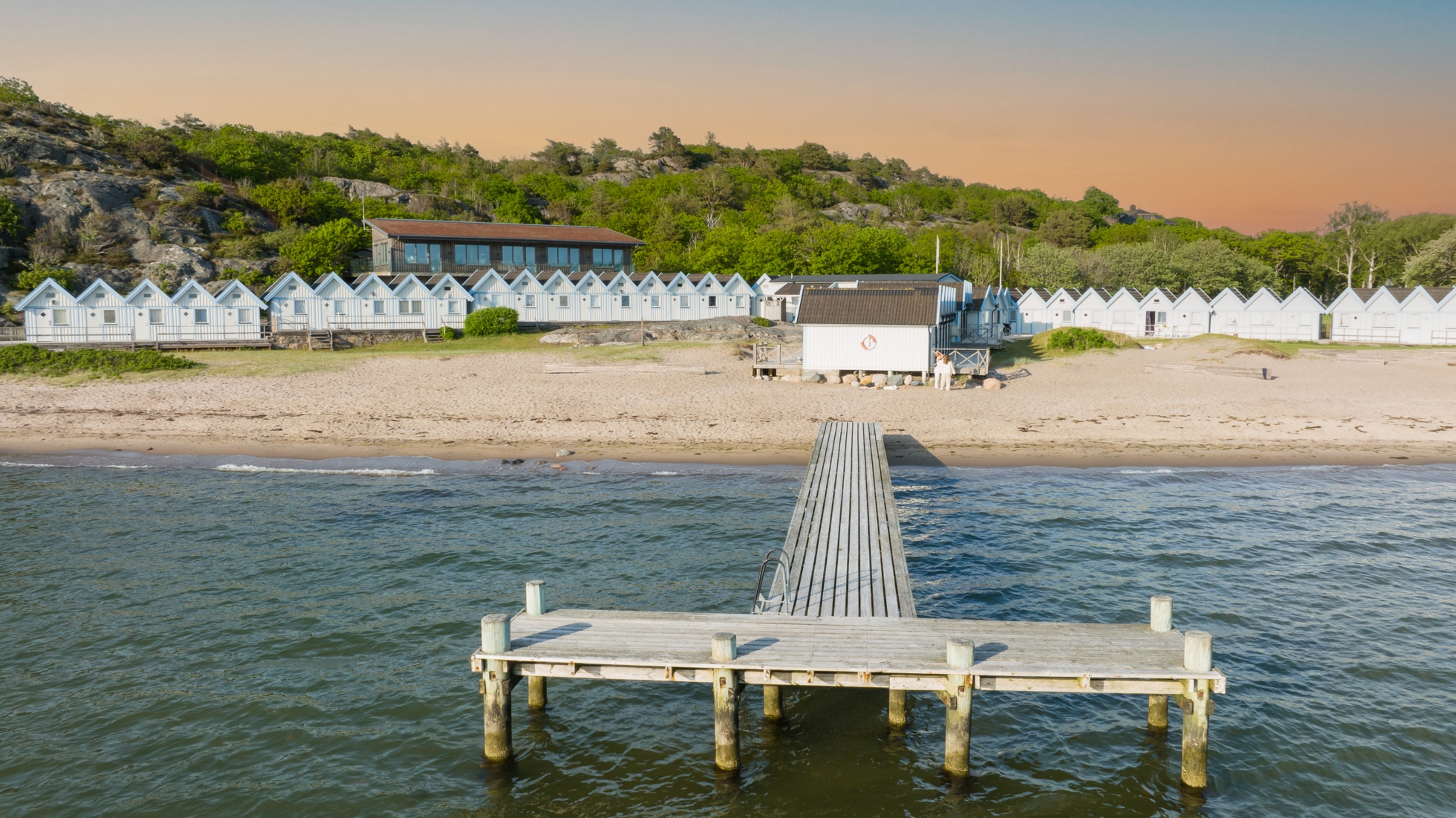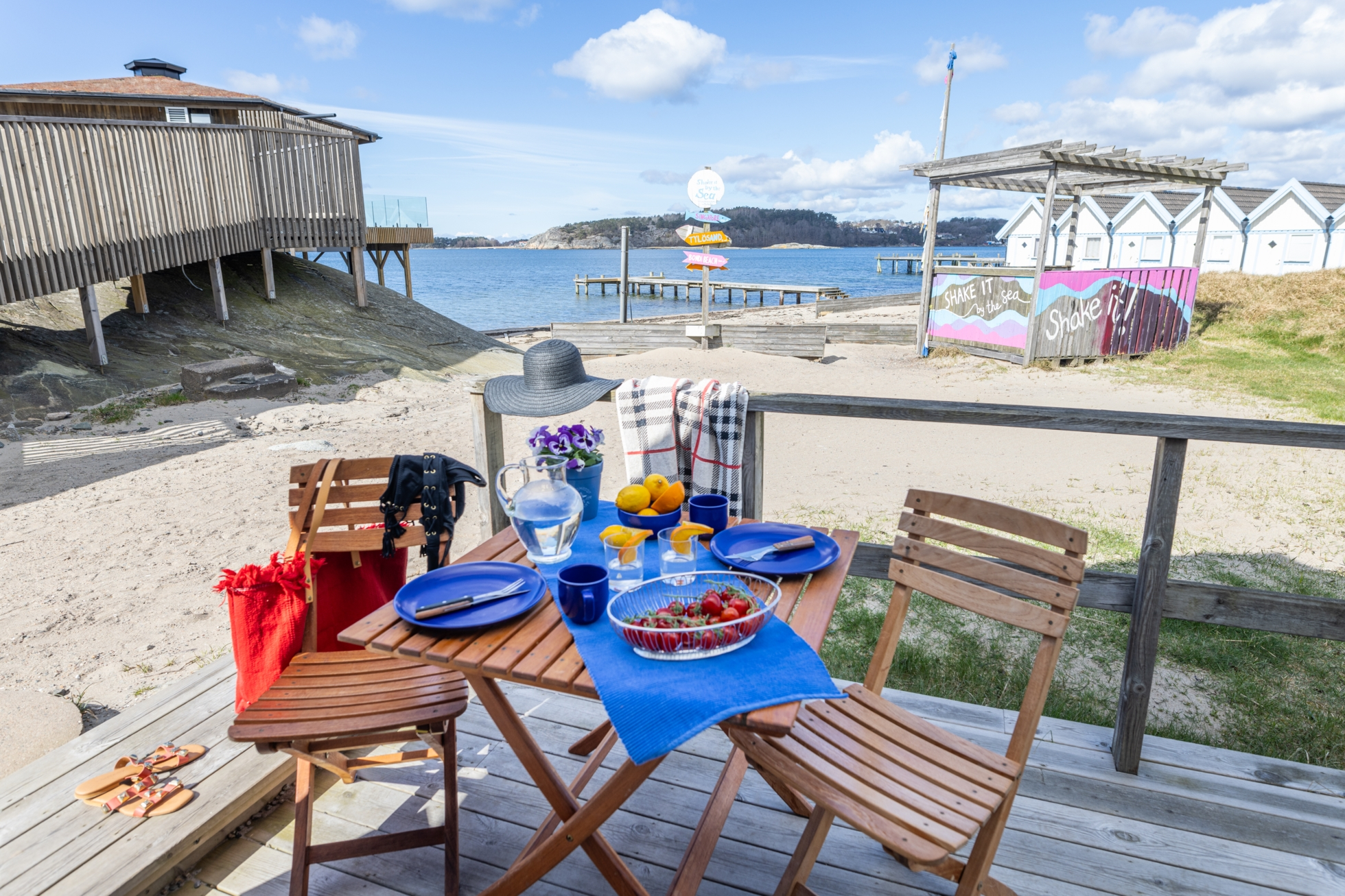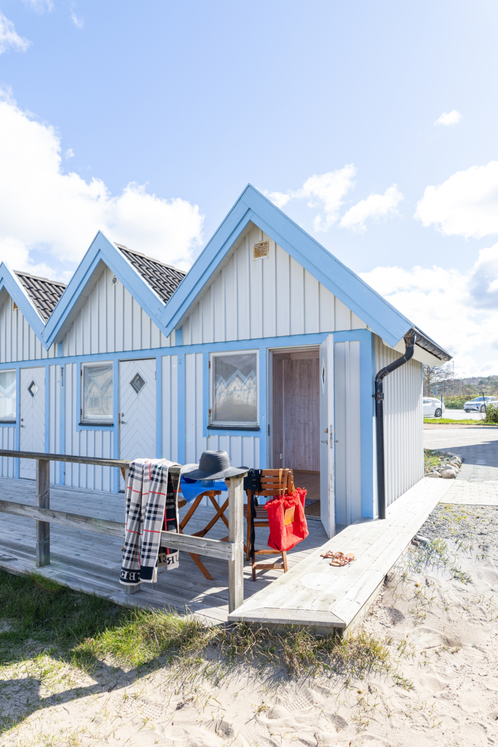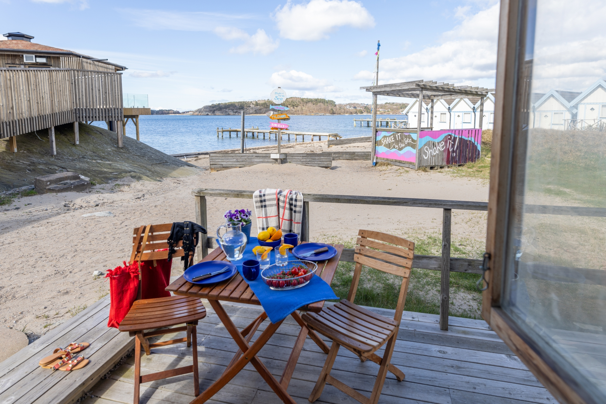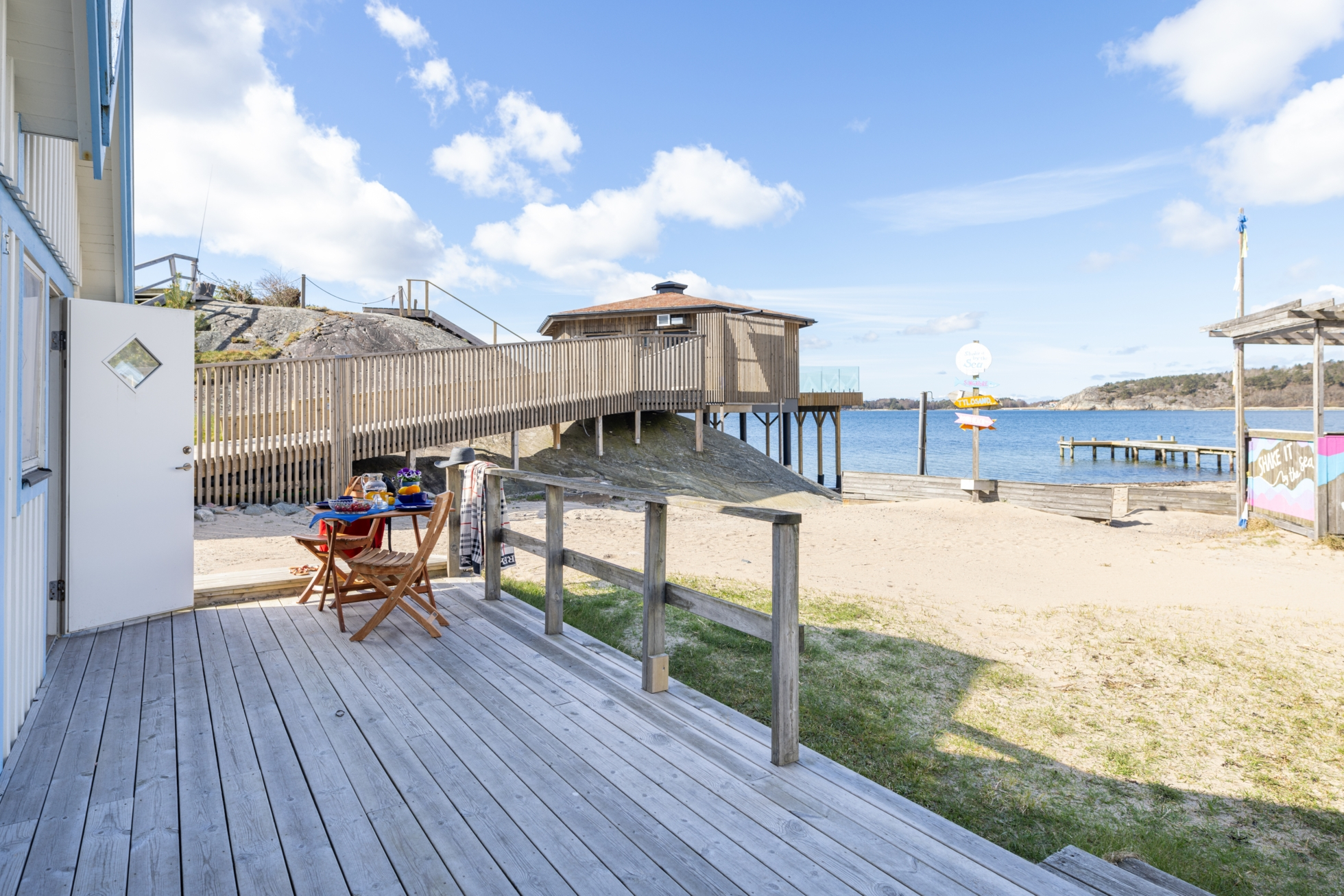 Bodarna om ca 7-7,5 kvm är smakfullt målade i vitt och blått och smälter fint in i västkustens vackra natur. Framför sjöboden löper en altan med bästa läge för sol.