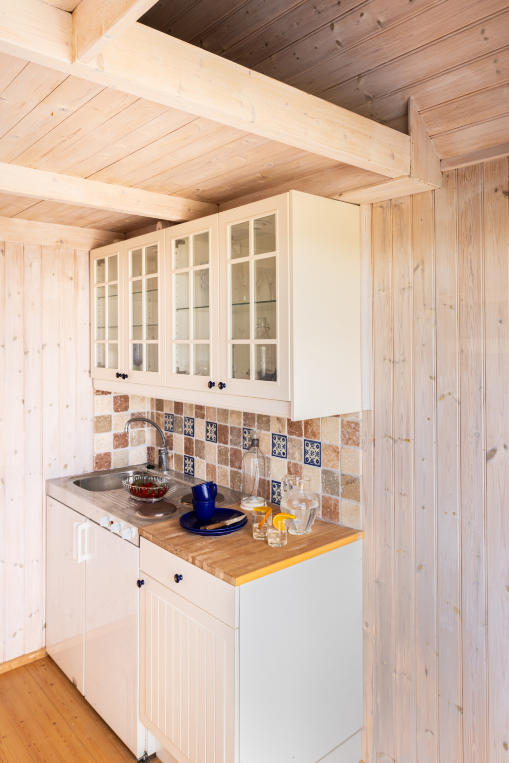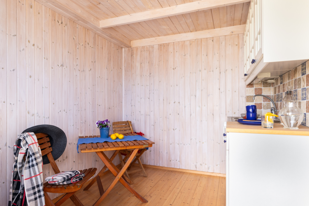 Interiören bjuder på stilrena väggar klädda i trä och ett golv av massiv trä. det finns ett fönster som ger fint ljusinsläpp och ett loft, som skapar extra förvaringsutrymme för en mer flexibel möblering på nedre delen av boden.